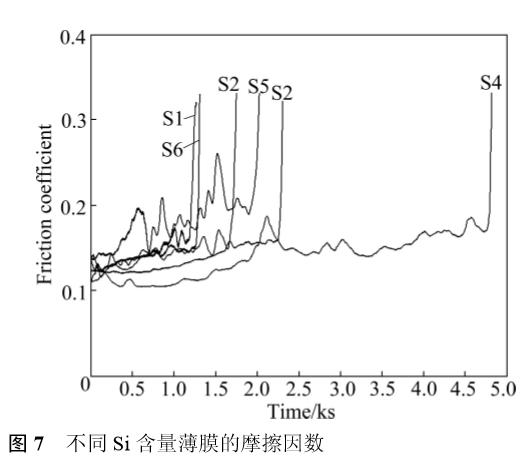 4)以Si3N4為對偶,薄膜的摩擦因數均維持在0.13~0.17之間;在Si含量為10.9%時,薄膜的摩擦因數和磨損率達到最低值。