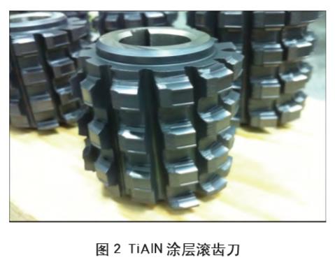 Al元素的加入不僅起到固溶強(qiáng)化的作用,同時由于晶格畸變,晶格常數(shù)變小,使得制備的TiAlN涂層的表面致密光滑。圖1為KedongZhang等采用陰極電弧技術(shù)在WC-CO硬質(zhì)合金基體上制備的TiAlN涂層的表面形貌圖和斷面圖(作者制備的TiAlN涂層滾齒刀如圖2所示)。