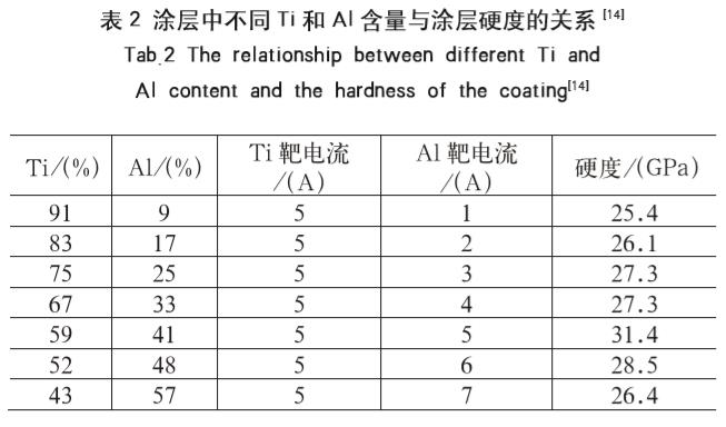 TiAlN三元復(fù)合涂層是在TiN涂層基礎(chǔ)上加入Al元素進(jìn)行合金化,進(jìn)而提高涂層的硬度,耐磨性和高溫穩(wěn)定性及改善涂層其它性能的方法。采用陰極電弧技術(shù)制備的TiN涂層的硬度約為23GPa。然而隨著TiAlN涂層中Al元素成分的增加,涂層的硬度先增加后減小,這是由于涂層中Ti元素與Al元素成分比例的不同造成的,采用Ti靶和Al靶制備的涂層中Ti和Al含量不同導(dǎo)致涂層的硬度也不同(如表2所示)。研究發(fā)現(xiàn),在Ti1-xAlxN涂層結(jié)構(gòu)中,當(dāng)x≤0.6時具有B1型NaCl結(jié)構(gòu),由于Al的固溶強(qiáng)化作用使得Al含量越高,涂層硬度越大;當(dāng)x≥0.7時,過高的Al含量使涂層中形成了富含AlN的釬鋅礦結(jié)構(gòu),涂層硬度會急劇下降。