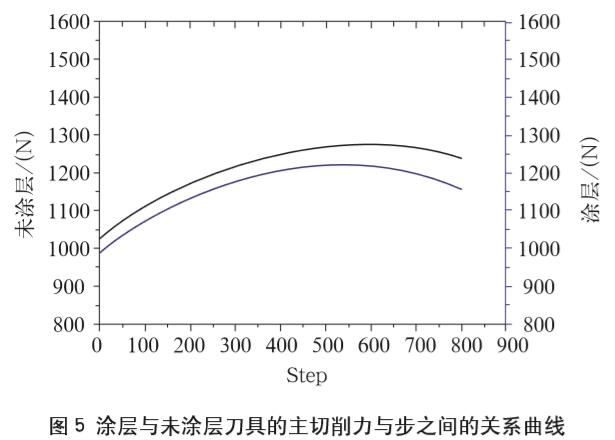 TiAlSiN涂層在高溫下具有良好的耐磨性和熱硬性,這些性能不僅僅與涂層的組織結(jié)構(gòu)有關(guān)。高溫條件下,涂層表面形成的n-TiO2/a-SiO2納米復(fù)合陶瓷結(jié)構(gòu)可以使涂層繼續(xù)保持高的硬度。Z.W.Xie等在800℃條件下對TiAlSiN涂層進(jìn)行硬度及磨損測試,試驗發(fā)現(xiàn)在高溫條件下涂層的硬度沒有下降,卻恰恰相反。作者采用DEFORM-3D軟件對TiAlSiN涂層的硬質(zhì)合金刀具(WC-Co)對鈦合金(Ti6Al4V)切削與未涂層的刀具進(jìn)行模擬切削試驗。比較發(fā)現(xiàn),TiAlSiN涂層不僅可以減少刀具切削過程中的切削力,而且可以起到很好的隔熱作用。涂層與未涂層刀具的主切削力與步之間的關(guān)系曲線(如圖5所示)。同時,TiAlSiN涂層具有良好的耐腐蝕性。