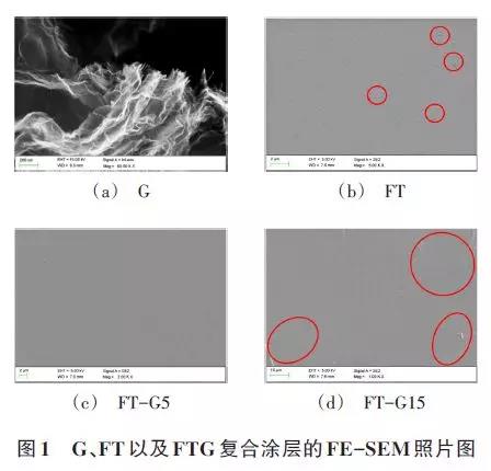 通過FE-SEM觀察石墨烯的微觀形貌特征,結(jié)果如圖1所示。由圖1可以看出,石墨烯呈薄紗卷曲形狀,這是由于石墨烯表面能較高,極易因表面電荷不平衡而失穩(wěn),破壞石墨烯本身的平面結(jié)構(gòu),因此呈現(xiàn)出褶皺形貌特征;FT涂層表面有微型大量孔洞及褶皺,而添加適量石墨烯后,涂層表面平整光滑,無明顯缺陷,當(dāng)石墨烯含量達(dá)到0.15wt%時(shí),涂層表面出現(xiàn)較多縫隙、裂紋等缺陷,且有團(tuán)聚塊出現(xiàn)。