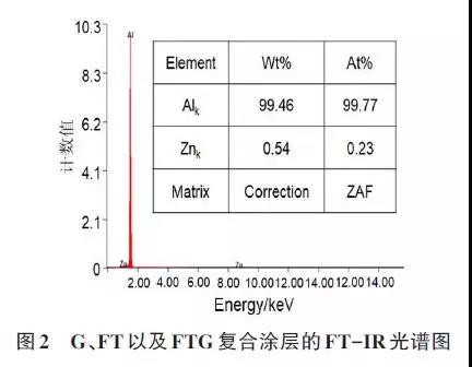 采用傅里葉紅外光譜儀(ThermoSceientificNi-coletiS10spectrometer,ThermoFisherScientificInc.)對(duì)樣品進(jìn)行官能團(tuán)檢測(cè)分析,掃描范圍為600~4000cm-1,粉末試樣采用KBr壓片法制備,實(shí)驗(yàn)前需將粉末在60℃烘箱中干燥24h,研磨后通過壓片機(jī)制備背景樣品并測(cè)試,將少量粉末試樣與KBr混合研磨,壓制實(shí)驗(yàn)樣品并測(cè)試,測(cè)試系統(tǒng)將自動(dòng)扣除背景紅外圖譜;將G分散在DMF中后真空干燥,采用ZEISSULTRA55場(chǎng)發(fā)射掃描電子顯微鏡(FESEM)對(duì)G和涂層表面微觀形貌進(jìn)行表征分析。