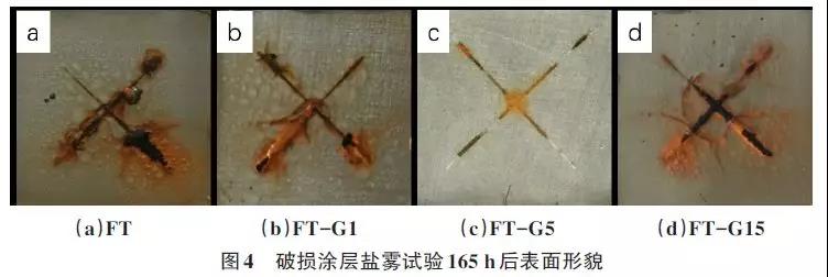 破損涂層中性鹽霧試驗(yàn)165h后的結(jié)果如圖4所示。FT、FT-G1和FT-G15復(fù)合涂層破損處腐蝕情況明顯比FT-G5涂層嚴(yán)重,腐蝕產(chǎn)物在縫隙處大量堆積甚至導(dǎo)致涂層剝離,且破損區(qū)域以外的部分有明顯吸水鼓泡現(xiàn)象。FT-G1涂層的鼓泡面積大于其他涂層,而FT-G5僅發(fā)生輕微腐蝕。這是因?yàn)镕T-G5涂層與基底金屬的結(jié)合強(qiáng)度較高,抗溶液擴(kuò)散滲透能力強(qiáng),提高了破損涂層在鹽霧環(huán)境中的耐蝕性能。