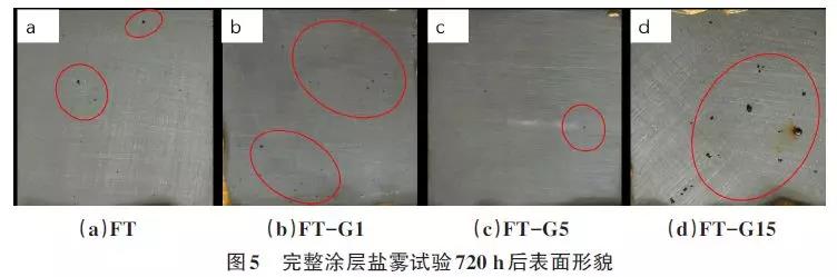 完整涂層鹽霧試驗(yàn)720h后的結(jié)果如圖5所示,圈中部分為涂層發(fā)生明顯點(diǎn)蝕部分。實(shí)驗(yàn)中發(fā)現(xiàn)FT、FT-G1、FT-G15在120h時(shí)均開始有少量微孔點(diǎn)蝕產(chǎn)生,且隨鹽霧試驗(yàn)時(shí)間延長(zhǎng)不斷增大增多。而FT-G5涂層的點(diǎn)蝕區(qū)域明顯少于其他涂層,表明其耐蝕性最好。FT-G15涂層的點(diǎn)蝕區(qū)數(shù)量最多,說明石墨烯含量過高對(duì)涂層的耐蝕性有不利影響。這是因?yàn)樵谟袡C(jī)涂層中添加適量石墨烯后,一方面,尺寸極小的石墨烯可以填充涂層孔隙,增加涂層致密性;另一方面,石墨烯片狀結(jié)構(gòu)則可以起到物理屏蔽作用,阻礙腐蝕介質(zhì)在涂層中的滲透,石墨烯的強(qiáng)疏水性對(duì)水分子在涂層中的滲透也起到進(jìn)一步阻礙作用,從而提高涂層的防護(hù)性能;而石墨烯含量過多時(shí),由于層片間的相互作用而容易發(fā)生團(tuán)聚,在涂層中形成孔洞、縫隙等缺陷,鹽溶液可以通過涂層缺陷滲透到基體,造成金屬的腐蝕,從而不利于金屬的腐蝕防護(hù)。