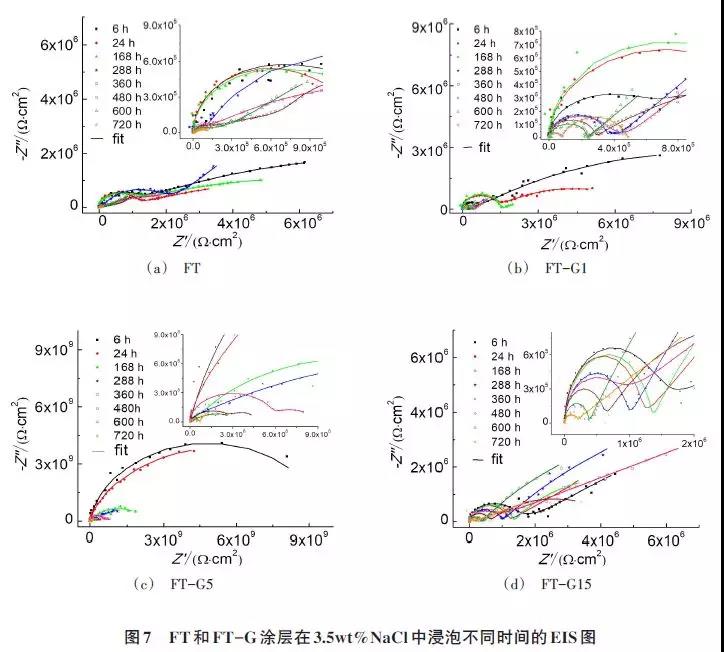 圖6為復(fù)合涂層開路電位(OCP)隨實(shí)驗(yàn)時(shí)間變化曲線,可以看出,各涂層體系的OCP均不斷降低,發(fā)生腐蝕的趨勢(shì)不斷增大。在涂層中添加G后,F(xiàn)T-G1涂層OCP在實(shí)驗(yàn)初期高于FT涂層,但實(shí)驗(yàn)到288h后兩者的OCP相接近,在實(shí)驗(yàn)720h后降低到-350mV左右,F(xiàn)T-G5涂層OCP在浸泡初期高于0mV,隨后不斷下降,在實(shí)驗(yàn)720h后保持在-300mV以上,而當(dāng)G含量達(dá)到0.15wt%時(shí),OCP在初期與FT涂層相近,在288h后急劇的下降,最終下降到-473mV,腐蝕趨勢(shì)增加,OCP較正的FT-G5涂層的腐蝕傾向低于其他涂層。