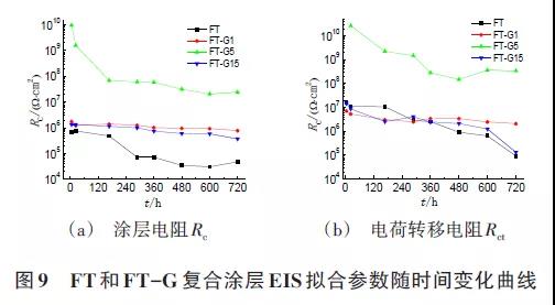 圖9為擬合所得的Rc和Rct,可以看到,F(xiàn)T-G5涂層的Rc和Rct遠(yuǎn)高于其他涂層,表明石墨烯含量為0.05wt%的復(fù)合涂層具有最佳的腐蝕防護(hù)性能。值得注意的是,F(xiàn)T-G5涂層的Rc和Rct在初期快速下降,隨后分別保持在107Ω·cm2和108Ω·cm2以上,這可能是由于涂層阻抗較高時(shí),腐蝕介質(zhì)在涂層中的滲透對(duì)涂層電阻的影響較明顯,導(dǎo)致涂層電阻和電荷轉(zhuǎn)移電阻的急劇下降;其他涂層的Rc和Rct變化相對(duì)較小,但在360h后Rc均低于106Ω·cm2,Rct比FT-G5涂層低2個(gè)數(shù)量級(jí)。可以明顯地看到,純氟碳涂層的Rc和Rct在長(zhǎng)時(shí)間浸泡后均低于復(fù)合涂層,表明添加石墨烯有利于提高涂層的防腐性能,其中含0.05wt%石墨烯的復(fù)合涂層腐蝕防護(hù)作用最好。