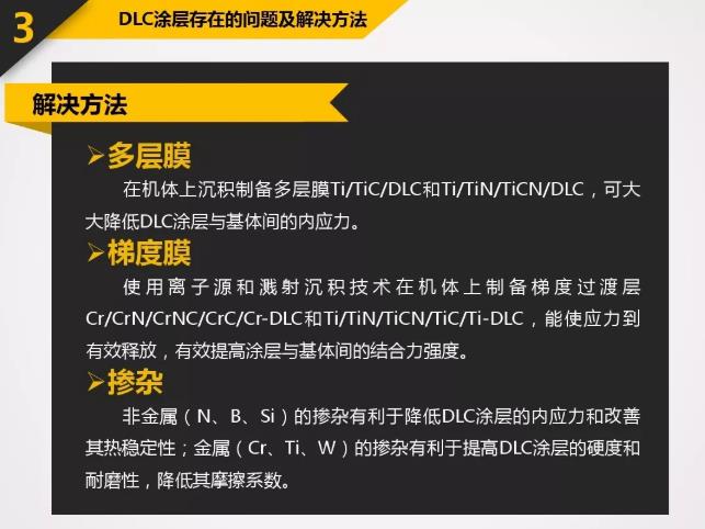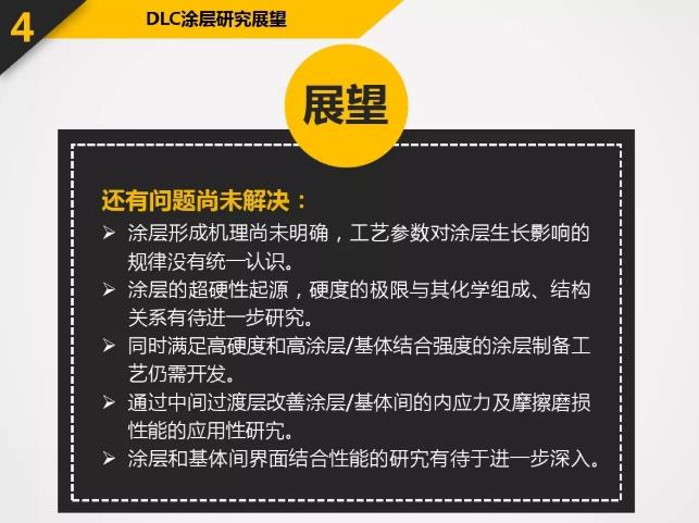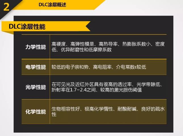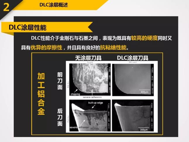 DLC具有很多優(yōu)良的特性:高硬度-60GPa或Hv6000以上;低摩擦系數(shù)-0.06;極好的膜層致密性;良好的化學(xué)穩(wěn)定性以及良好的光學(xué)性能等。應(yīng)用于刀具上的DLC涂層所表現(xiàn)出的特殊性能遠(yuǎn)超過(guò)其它硬質(zhì)涂層。涂以DLC的刀具主要應(yīng)用包括:石墨切削,各種有色金屬(如鋁合金,銅合金等)切削,非金屬硬質(zhì)材料(如亞克力,玻璃纖維,PCB材料)切削等。