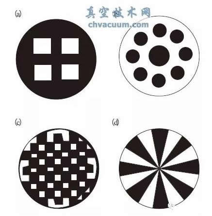 在有些情況下,不易制備大面積的均勻合金靶、化合物靶,這時可以采用由單元素組成的復(fù)合鑲嵌靶,靶表面的構(gòu)成如圖1所示。其中圖d所示的扇形鑲嵌結(jié)構(gòu)效果最好,易于控制膜的成分,重復(fù)性也好。從原理上講,不僅二元合金,三元、四元等合金膜都可以用這種方法制取。