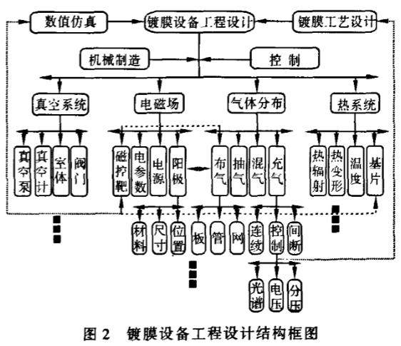 對于濺射鍍膜來說,可以從真空系統,電磁場,氣體分布,熱系統等幾個方面進行沒計,機械制造和控制貫穿整個工程設計過程,參照圖2。