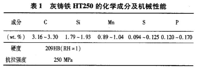 試驗機床為ETC3650h數(shù)控機床,機床主軸功率15kW,最高轉(zhuǎn)速4000rpm。裝夾刀桿編號為CRGN525M1207,刀片安裝角度為:前角γ0=-6°,后角α0=6°,主偏角Kr=45°。刀具失效標(biāo)準(zhǔn)為后刀面磨損量VB=0.3mm。切削用量為:Vc=300m/min,f=0.1mm/r,ap=0.5mm。工件材料為HT250灰口鑄鐵,工件尺寸為Φ100mm×150mm,該鑄鐵的化學(xué)成分與機械性能如表1所示。