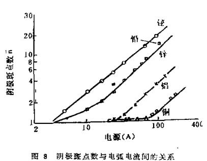 多弧靶源的真空電弧放電其電弧電流是由靶面上的陰極弧斑提供的,對某一材質的陰極靶來說,陰極斑點上所能承受的電流值是一定的,表1列出了不同陰極材料陰極斑點的平均電流值。陰極斑點數與電弧電流值成正比。隨著電弧電流的增加,陰極斑點的數目也增加,且相互獨立的運動。圖8給出了幾種材料的陰極斑點數與陰極電弧電流間的關系曲線。假定因某種原因造成某個弧斑熄滅,但其余的弧斑仍然正常燃燒并很快分裂恢復原來的電流值和弧斑數目,使電弧得以穩定燃燒。所以電弧電流越大,電弧斑點數就越多,滅弧的可能性就越小。