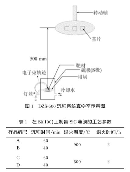 實驗采用中國科學院沈陽科學儀器公司研制的DZS-500電子束沉積系統。選擇單晶Si(100)作為基片,并將其切割成10mm×5mm的方片。對基片分別用丙酮、乙醇和去離子水超聲清洗15min。靶材采用純度為98%的SiC壓片。坩堝和基片之間的垂直距離為500mm。在EB-PVD蒸發沉積過程中,E型槍所產生的高能電子束流將SiC靶材熔化蒸發,使其沉積到基板的Si片上形成薄膜,如圖1所示。沉積過程中真空度為6.7×10-3Pa,設定沉積速率為0.6nm/s,薄膜沉積時間分別為40、60min。電子束流強度30~60mA。沉積結束后繼續保持高真空狀態,待自然冷卻后,打開真空室取出試樣。對制備態試樣在2.0×10-2Pa真空中進行退火處理,退火溫度分別為600、900℃,退火時間均為2h,SiC薄膜制備工藝參數見表1所列。