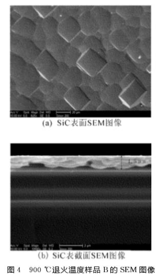 (3)SiC薄膜的SEM形貌分析。圖4所示為厚度為1.5μm的SiC薄膜樣品B經900℃退火2h后的SEM圖像。圖4表明,SiC薄膜晶粒的晶界清晰,結晶狀態良好,薄膜表面平整且致密。