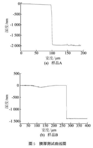 (4)SiC薄膜的膜厚測量。使用臺階儀(Xp-100)測量SiC薄膜的厚度。圖5所示分別為樣品A、B的膜厚測試曲線,由圖5得到樣品A的膜厚約為2.0μm,樣品B的膜厚約為1.5μm。這表明鍍膜時間越長,沉積膜層越厚。
