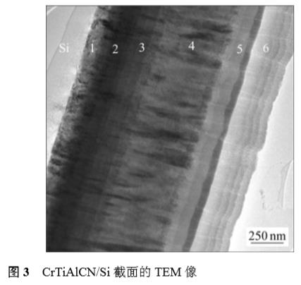 圖3所示為CrTiAlCN梯度膜層的橫截面TEM像。從圖中可明顯觀察到Si基體、過渡層及CrTiAlCN梯度膜層,并可清晰分辨出過渡層第1層和第2層為Cr-CrN層,厚度約為350nm;第3層和第4層為梯度CrTiAlN層,厚度約為650nm;第5層和第6層為CrTiAlCN層,厚度約為500nm,膜層總厚度約為1.5μm。膜層與基體的結合力大于80N,達到甚至優于陰極電弧離子鍍TiN等硬質薄膜的結合強度;膜/基復合顯微硬度HV0.025,15=26.31GPa,與鋼對磨摩擦因數為0.113,硬度及摩擦性能明顯優于用此方法制備的類金剛石膜。