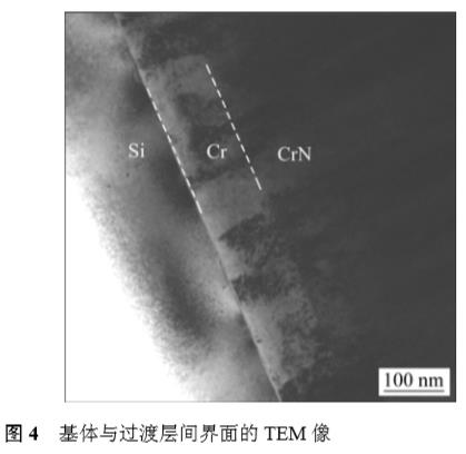 圖4所示為樣品中基體與過渡層之間界面的較高倍率TEM像。由圖4可知,基體Si與Cr層界面較為明顯,Cr層厚約100nm(與設計值相吻合),產生這種較為明顯的界面的原因是:Si襯底的溫度低,有效降低Si元素的擴散能力,使在Si襯底上生成Cr膜層時抑制Si元素對Cr層的擴散,因而基體Si與Cr層界面較為明顯。而Cr層與CrN層界面不太清晰,界面之間柱狀晶錯開的角度不明顯,基本都是沿垂直于基體表面方向生長,隨著成分的改變,顏色逐漸加深,Cr層與CrN層之間結合良好。這主要是膜層沉積時在不改變Cr靶功率的前提下,N的含量逐漸增加所致。
