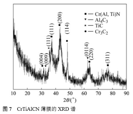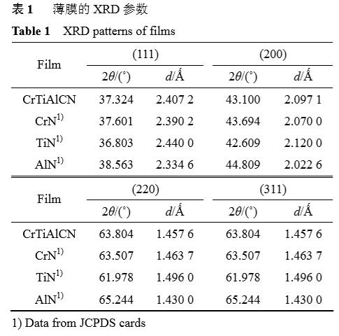 圖7所示為CrTiAlCN薄膜的XRD譜。由圖7可知,由于受多相疊加和表層中納米晶碳化物的影響,衍射峰更寬化,強度更低,數量更多。由圖7可知,(111)、(200)、(220)及(311)衍射峰的晶格常數與CrN及AlN晶體結構的晶體格常數相比明顯偏大,與TiN晶體結構相比明顯偏小,具體參數見表1。這主要是Ti、Cr和Al原子之間互相部分替換了原氮化物晶格中的金屬原子并保持原有的晶格所致。除此之外,Cr3C2的(114)及(004),TiC的(111),Al4C3的(0114)及(009),這些峰強度都較弱,說明膜層中碳化物的含量與氮化物含量相比較少。