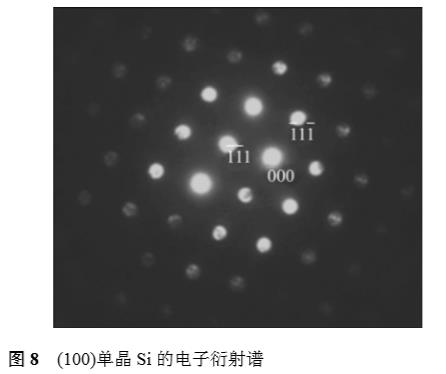圖8所示為基體硅的電子衍射圖。由圖可知,(000)為中心透射斑,該斑到)111(及)111(衍射斑的距離均為12.5mm;而硅{111}的面間距3.140Å,根據公式Lλ=Rd,可求得儀器常數Lλ為39.250mm·Å。另外,(000)到)002(衍射斑的距離經測量為14.5mm,而硅{200}的面間距為2.719Å,根據公式Lλ=Rd,可求得儀器常數Lλ為39.429mm·Å;取平均值,可得儀器常數Lλ為39.369mm·Å。