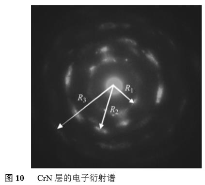 圖10所示為CrN層的電子衍射譜。圖中,中心透射斑到衍射環的距離經測量分別為R1=19.0mm,R2=31.0mm,R3=47.0mm,已知Lλ=39.369mm·Å,根據公式Lλ=Rd,可求得它們對應的面間距分別為d1=2.072Å,d2=1.270Å,d3=0.837Å,與PDF標準卡片值也較符合。