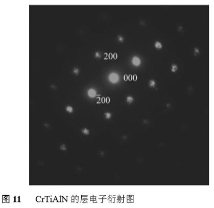 圖11所示為CrTiAlN層的電子衍射譜。圖中,(000)為中心透射斑,經測量其到)002(及(200)衍射斑的距離均為18.8mm,已知Lλ=39.369mm·Å,根據公式Lλ=Rd,可求得(200)的面間距d=2.094Å;另外,(000)到)202(的距離經測量為26.5mm,同樣可求得)202(的面間距d=1.485Å。通過查PDF標準卡片,從表1可以看出,CrTiAlN層的(200)及(220)的面間距與標準卡片中CrN及AlN的(200)及(220)的面間距相比明顯偏大,比TiN的參數明顯偏小,這與XRD的分析結果完全一致。說明Ti、Cr、Al原子之間互相部分替換了氮化物晶格中的金屬原子。