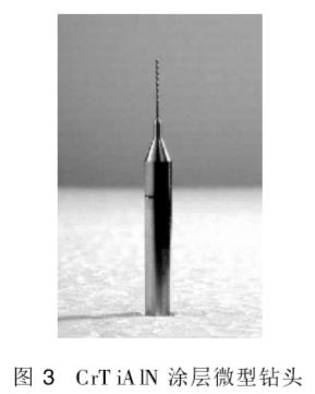 通過添加不同金屬或非金屬元素的單層多元硬質薄膜及與多元疊加組合的多層硬質膜,在不同程度上優化了薄膜的成分、結構,改善了膜層強度和韌性的匹配,提高了膜層的力學和化學性能。在要求更高的工模具及抗高溫氧化領域得到應用。廣州有色金屬研究院利用電弧離子鍍制備的(Cr,Ti,Al)N涂層的抗氧化溫度高達900;利用中頻反應濺射輔以陽極層流型矩形氣體離子源相結合的方法制備的(Cr,Ti,Al)N膜層,其表面細膩致密,沉積速率高,膜層硬度高達3500Hv,膜/基結合力大于80N,并且膜層韌性良好。在實際應用中,明顯提高了銑刀、鉆頭、滾齒刀等工具的使用壽命。為了進一步提高CrTiAlN薄膜的摩擦性能,研究了在其基礎上添加微量元素(Cu,C,B等)和多層結構的薄膜,結果顯示膜層的摩擦系數明顯降低,小于02;在明顯提高微鉆壽命的情況下,解決了斷針、批鋒、塞孔、孔位精度、孔壁粗糙度等問題,達到了產品所要求的技術指標。圖3為廣州有色金屬研究院用中頻反應濺射輔以陽極層流型矩形氣體離子源相結合的方法沉積(Cr,Ti,Al)N涂層的微型鉆頭。