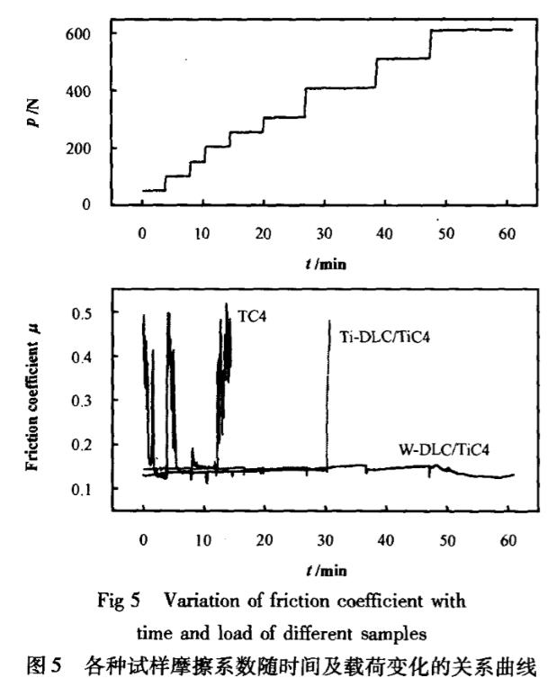圖5所示為TC4基底、Ti-DLC/TC4及W-DLC/TC4薄膜在漸進加載條件下與16Ni3CrMo鋼對摩時,摩擦系數(shù)隨時問變化的關系曲線,圖中上半部為所加載荷隨時間的漸進方式,下半部為各樣品所對應的摩擦系數(shù),可以看出:TC4基底的摩擦系數(shù)明顯高于表面經(jīng)DLC處理的試樣,存在較長的“磨合期”;當載荷增至200N時,摩擦系數(shù)在0.25~0.50之間劇烈變化,當載荷超過200N時,由于摩擦力太大,已經(jīng)不能保證試驗的沖程距離而停止試驗,而對于表面經(jīng)DLC處理的2種涂層,由于其主要成分為非晶碳,少量的硬質(zhì)TiC或WC微晶彌散于非晶碳中,在載荷小于400N下對涂層的摩擦系數(shù)影響較小,2種涂層的摩擦系數(shù)基本穩(wěn)定在0.13~0.15之間,沒有大幅起伏變化和明顯“磨合期”.當載荷超過400N后,Ti-DLC/TC4的摩擦系數(shù)急劇升高,這主要是由于樣品的表面粗糙度較高,在上、下試樣間容易產(chǎn)生局部高接觸應力;當接觸應力高于涂層承受能力時,則造成涂層的部分“坍塌”和剝落,使兩者從邊界潤滑磨損轉(zhuǎn)變?yōu)槲⒀心ツp和與基底的粘著磨損,導致摩擦系數(shù)升高,W-DLC/TC4薄膜的摩擦系數(shù)直到載荷600N時均無顯著變化,這主要是由于W-DLC/TC4薄膜的硬度和承載能力較高、膜/基結(jié)合強度較好,涂層沒有出現(xiàn)“坍塌”和剝落現(xiàn)象;而載荷越高,摩擦系數(shù)越小,這與摩擦過程中DLC膜層在高載荷作用下的石墨化有關。