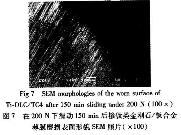 圖7所示為Ti-DLC/TCA薄膜在漸進加載(圖5上半部方式)至200N、保載滑行150min后(摩擦系數(shù)突變)的磨損表面局部形貌SEM照片可見:在磨痕表面粘著痕跡極少,以磨粒磨損為主,磨損區(qū)域與未磨損區(qū)界面為逐漸過渡,磨痕較淺,這主要是由于Ti-DLC/TC4薄膜/基較硬,承載能力較強,但膜層在較高載荷下,受膜/基結(jié)合強度不高及內(nèi)應力的影響,摩擦-定時間后出現(xiàn)疲勞裂紋,繼而出現(xiàn)顆粒剝落而形成磨粒,導致磨粒磨損;而在局部磨損嚴重區(qū)域與偶件出現(xiàn)粘著現(xiàn)象,其原因是由于當局部接觸應力大于薄膜的承載能力時造成部分膜層“坍塌”或剝落,因此,Ti-DLC/TC4薄膜比TC4基底的磨損率和摩擦系數(shù)低、失效時間長。