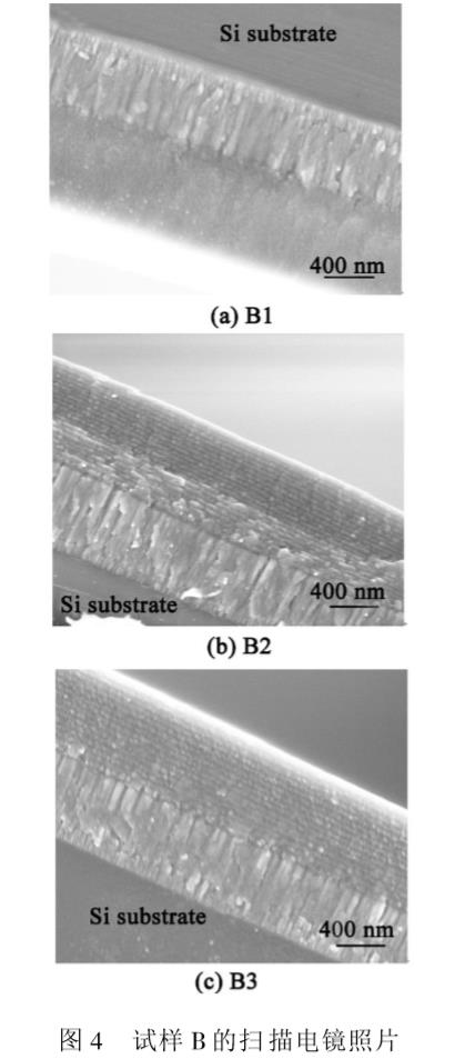 圖4是試樣B的掃描電鏡照片,靠近基體Si的部分是過渡層,呈柱狀組織,厚約650nm,剩下的膜層是TiC/DLC多層膜,厚約730nm,圖4(a)的TiC/DLC膜層既未出現多層狀結構,也未見柱狀組織,圖3(b)、3(c)的層狀結構清晰可見,根據表2的沉積工藝可知,分層膜的沉積時間太短,不利于薄膜中多層結構的形成,但Ti靶和甲烷氣體交替開啟,卻能抑制薄膜中柱狀組織的形成。
