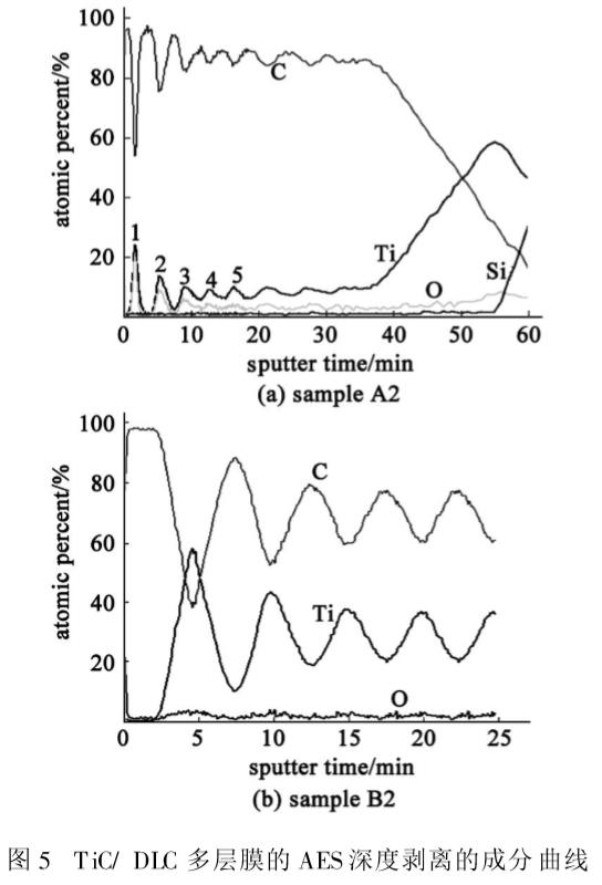 圖5是試樣A2和B3的俄歇電子能譜(AES)圖,顯示各試樣中Ti與C兩者的成分變化情況,圖5(a)中A2試樣表面出現成分周期起伏現象,約5個周期,10個分層,在靠近基體的過渡層處,成分起伏現象消失,這一結果與透射電鏡觀察一致。C的原子含量在90%~85%范圍內變化,Ti的原子含量在5%~10%變化,膜中Ti的成分比例遠小于C的;圖5(b)是采用2個Ti靶,且Ti靶電流升至75A時所制備的試樣B3中Ti與C兩者的成分變化現象,僅顯示靠近表面的4個周期,從圖中可知C與Ti的原子含量的差距縮小,其中C的原子含量在85%~60%范圍內變化,Ti的原子含量在20%~40%變化,由此可知當甲烷氣體流量不變時,隨著Ti靶電流的增加,膜中Ti與C的成分比例發生變化,Ti的成分線性增加,C的成分相應減少。另外,所有試樣都含有小部分氧,這可能與爐膛的真空度有關。