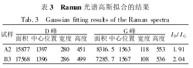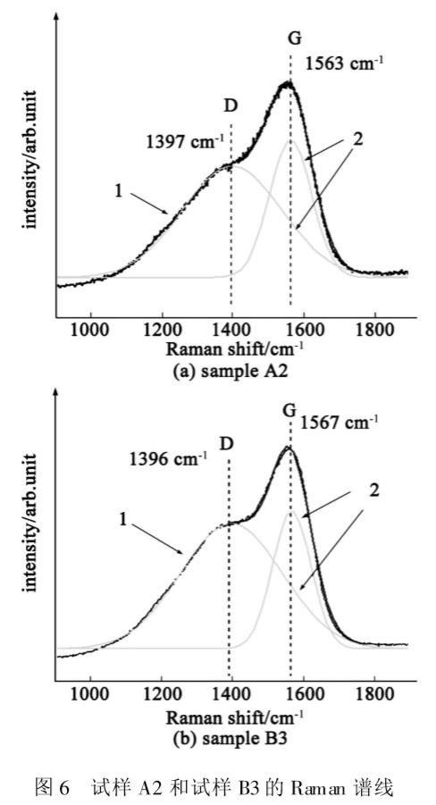 Raman光譜是用于確定DLC膜精細鍵結構的常用方法之一。圖6是試樣A2和B3的Raman譜線,圖中的曲線1是原始測試曲線,它們都是由高波數段1580cm-1(G峰)附近的一個寬峰和低波數段1350cm-1(D峰)附近的一個肩峰組合構成,屬于典型的DLC特征譜線,曲線2是Raman光譜的高斯擬合曲線,被擬合出2個峰,其中心分別為1397cm-1和1396cm-1的D峰和中心為1563cm-1和1567cm-1的G峰,相對于石墨的特征峰G峰向低波數段方向分別偏移了19cm-1和13cm-1,具有這種Raman特征峰的C膜含有一定數量sp3雜化C原子,D峰的存在同時表明C膜中含有sp2雜化C成分,說明sp2雜化C原子鑲嵌在sp3雜化C原子做成的基體中。根據ID/IG的比值和峰偏移位置,可以定性地表示sp3的含量,對Raman譜的D峰G峰進行面積積分計算出對應的峰強度比值ID/IG如表3所示,說明用非平衡磁控濺射方法制備的TiC/DLC多層膜中含有金剛石成分,其中試樣A2的ID/IG比值為191,試樣B3的ID/IG比值為204,說明A2中sp3雜化C原子濃度比B3中高,這是由于試樣制備工藝參數不同引起得。試樣A2的Ti靶電流低于試樣B3,當甲烷氣體流量不變時,爐膛中C/Ti的流量比不同,試樣A2的C/Ti的流量比高于試樣B3,由此使得A2中sp3雜化C原子濃度比B3中高。另外ID/IG值的變化與DLC薄膜的結構和性能有直接的關系,ID/IG值越小,薄膜中的sp3C成分越多,相應的薄膜顯微硬度值應該越大。