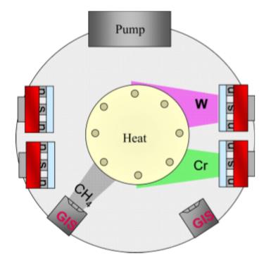 實驗選用多功能離子鍍膜設(shè)備。采用陽極層流型矩形氣體離子源,并結(jié)合非平衡磁控濺射進行摻鎢類金剛石薄膜沉積,其裝置結(jié)構(gòu)示意如圖1所示。該裝置有4個尺寸為720mm×120mm的非平衡磁控濺射靶(Unbalanced magnetron,UBM),利用其中2個靶分別裝上Cr和W靶,進行過渡層Cr和在沉積DLC/WC層時濺射出W等離子體;2個長720mm的陽極層流型氣體離子源(Ion beam source,IBS),利用與靶對面的離子源通入反應(yīng)氣體(CH4)離化射出沉積類金剛石膜。利用空間的布置,當(dāng)樣品旋轉(zhuǎn)至離子源前面時,主要沉積DLC薄膜;當(dāng)在磁控靶前面時,主要沉積WC薄膜,最終實現(xiàn)DLC/WC多層膜的制備。