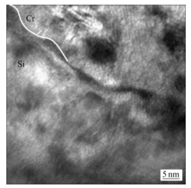 圖4所示為基體(Si)與過渡層之間界面的較高倍率TEM像。由圖4可見,在Si基體和過渡層Cr之間微觀界面(劃線處)結(jié)合良好。