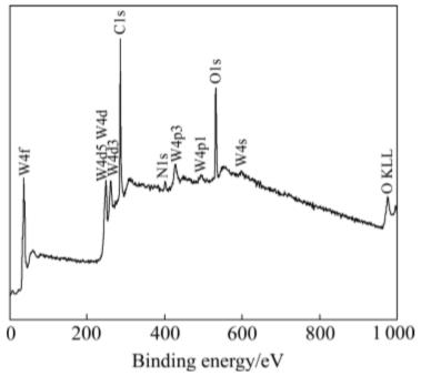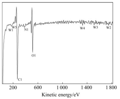 圖7所示為DLC/WC膜樣品表面的俄歇成分全譜圖。由圖7可見,所沉積的膜層表面主要元素為C和W,少量的N和O是由于表面化學(xué)吸附及在沉積過程中真空室(本底真空度5mPa)中有N及O的存在所致。