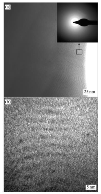 分別采用PHI Quantera SXM型X射線光電子能譜儀(XPS)、Philips X Pert MPGD X射線衍射儀(XRD)、CM200FEG型透射電子顯微鏡(TEM)及PHI−610/SAM型掃描俄歇微探針(AES)分析膜層的微觀結(jié)構(gòu)和成分組成;MH−5型顯微硬度計測量膜基硬度,MS−T3000型球−盤摩擦磨損實驗儀測量摩擦因數(shù),HH−3000薄膜結(jié)合力劃痕試驗儀測量膜基結(jié)合力。
