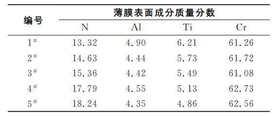 表2 不同靶/基距 CrTiAlN薄膜表面成分質(zhì)量分數(shù)