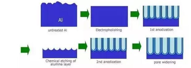 陽極氧化:主要是鋁的陽極氧化,是利用電化學(xué)原理,在鋁和鋁合金的表面生成一層Al2O3(氧化鋁)膜。這層氧化膜具有防護(hù)性、裝飾性、絕緣性、耐磨性等特殊特性。