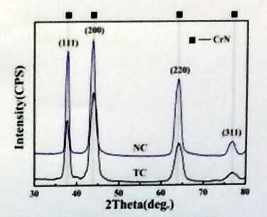 CrN相有(111)、(200)、(220)和(311)方向的衍射峰。NC所有衍射峰相比于TC的衍射峰整體變強,說明新型離子清洗技術(shù)有效提高了CrN相的結(jié)晶度。物相檢測中未檢測出AlN相是因為Al原子以固溶物的形式存在于面心立方的CrN相中。