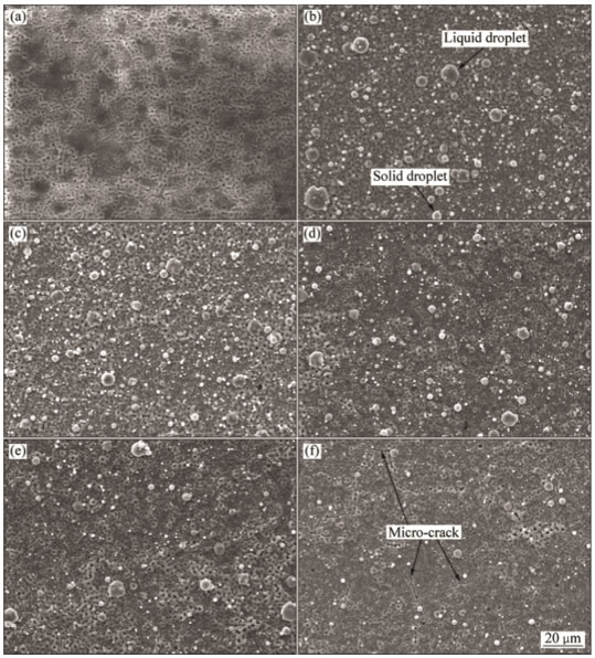 Fig.2SurfacemorphologiesofMAOandMAO/Ticoatingspreparedatdifferentmagneticcurrentsfor30min:(a)MAO;(b)MAO,0A;(c)MAO,5A;(d)MAO,10A;(e)MAO,15A;(f)MAO,20A