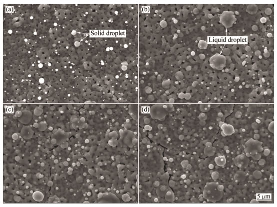 Fig.3SurfacemorphologiesofMAO/Ticoatingspreparedbyvaryingdepositiontimewithmagnetic:(a)MAO,10A,30min;(b)MAO,10A,60min;(c)MAO,10A,90min;(d)MAO,10A,120min