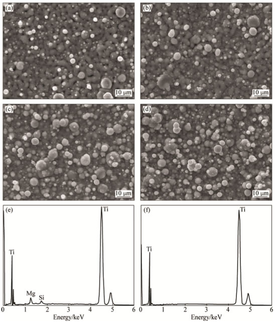 2.3沉積時間對膜層表面形貌的影響圖3所示為10A磁場電流條件下不同沉積時間所得MAO/Ti復合涂層的表面形貌。由圖3可見,隨著沉積時間從30min增加到120min,膜層表面的熔滴顆粒數量逐漸增加,但仍不能完全覆蓋MAO膜。同時,隨著沉積時間的增加,微弧氧化MAO膜表面的微裂紋明顯延伸和長大。由圖1可知,外加磁場時,溫度隨沉積時間的延長增加更快。而鎂合金、MAO膜以及Ti鍍層線膨脹系數存在較大差異,這必然引起MAO膜表面微裂紋的萌生和長大(見圖3(c)~(d))。微裂紋的產生和生長,必然降低微弧氧化膜對鎂合金基體的腐蝕防護。此外,隨著沉積時間的增加,可見膜層表面的大尺寸液體熔滴顆粒增多,固體顆粒雖也有增加趨勢,但仍以小尺寸顆粒為主。表明磁過濾可有效減少或消除大顆粒,但液體熔滴顆粒的增加以及尺寸的增大,可能與磁場引起的溫度升高有關。圖4所示為無外加磁場條件下不同沉積時間所得MAO/Ti復合涂層的表面形貌及元素組成。當沉積時間為30min和60min時,復合涂層的表面仍可見MAO膜的微孔等形貌特征(見圖4(a)~(b));當沉積時間為90min和120min時,不能觀察到MAO膜的形貌特征(見圖4(c)~(d))。為了確定Ti鍍層是否完全覆蓋MAO膜,采用EDS對復合膜層表面進行了元素面掃描分析(見圖4(e)~(f))。當沉積時間為60min時,復合膜由Mg、Si和Ti元素組成。Mg和Si來自MAO膜,而Ti來自Ti鍍層。然而,沉積時間為90min時,復合膜僅由Ti元素組成,而未檢測到Mg和Si元素。由此可確定沉積時間為90min時,Ti鍍層已完全覆蓋MAO膜。與圖3相比,在相同時間內的膜層表面覆蓋了更多Ti顆粒;而且,Ti鍍層以大尺寸球形顆粒為主,而液體熔滴幾乎沒有,從而證實了外加磁場能過濾掉尺寸較大的固體顆粒,大幅度降低沉積速率。