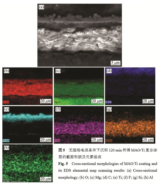 2.4MAO/Ti涂層截面形貌及元素組成圖5所示為無外加磁場條件下沉積120min所得MAO/Ti復合涂層的截面形貌及元素組成。由圖5(a)可見,MAO/Ti復合涂層厚度12~13μm,其中MAO膜厚約10μm,Ti鍍層厚度為2~3μm;MAO膜與Ti鍍層之間較為緊密,存在少量微裂紋,這與試樣截面打磨和拋光過程中溫度升高而引起的截面分離有關。但仍可見Ti鍍層與MAO膜之間的界面有部分互滲的現象,表明MAO膜與Ti鍍層之間不是單純的附著關系,這有利于增強界面結合強度。一般的多弧離子鍍涂層具有良好的附著力,其原因之一是轟擊的等離子體攜帶的動能變為熱能,從而對基體表面產生了一個自加熱效應,從而提高基體表面層組織的結晶性能,進而促進化學反應和擴散作用。圖5(b)~(h)所示為截面形貌對應的元素面分布,MAO/Ti復合涂層中存在O、Mg、F、Si、Al和Ti等元素,其中,O、Mg、F、Si、Al來自基體和MAO膜,而Ti來自Ti鍍層。從截面元素O的面分布可見,MAO膜和Ti鍍層之間存在部分互滲的現象。