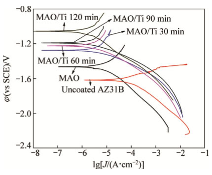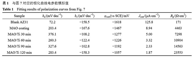 2.6極化曲線由圖2和3可知,引入外加磁場后,在MAO膜表面并未獲得完全覆蓋的Ti鍍層;而且,由于加速的轟擊粒子引起真空室內溫度迅速升高,導致MAO膜表面微裂紋的萌生和生長。這將降低MAO/Ti復合涂層對鎂合金基體較差的腐蝕防護能力。相反,無外加磁場條件下,隨著沉積時間的增加,在MAO表面獲得了完全覆蓋的Ti鍍層(見圖4(c)~(d))。研究表明,在鎂合金基體表面預鍍Ti,可提高后續涂層對鎂合金的腐蝕和耐磨性能。但也有文獻報道,Ti與Mg的標準電極電位相差較大,容易在腐蝕介質中形成電偶電池而加速基體腐蝕和涂層剝離。因此,對無外加磁場條件獲得的涂層樣品進行了極化曲線測試,考察其對鎂合金基體的腐蝕防護能力(見圖7),通過電化學軟件模擬的相關電化學參數值如表1所列。結合圖7和表1,空白鎂合金AZ31的φcorr和Jcorr分別為−1648mV和125.8μA/cm2,MAO處理后,其φcorr正移了151mV,Jcorr降低了近兩個數量級。這表明MAO膜能降低鎂合金基體的腐蝕速度,起到了腐蝕保護的作用。與MAO樣品相比,沉積30min的MAO/Ti復合涂層樣品的φcorr正移了190mV;Jcorr變化較小,但仍呈現出減小的趨勢。并且,隨著沉積時間由30min增加到120min,其φcorr由−1277mV正移到了1057mV,Jcorr由5μA/cm2減小到1.87μA/cm2。φcorr正移意味著腐蝕的難度增加;而Jcorr的減小說明腐蝕速度降低。此外,MAO/Ti復合涂層樣品的Rp值明顯大于空白鎂合金和MAO樣品,Rp的增大表明涂層的致密性增加,腐蝕難度進一步增大。由此可見,Ti鍍層進一步增強了MAO膜對鎂合金的腐蝕防護能力。